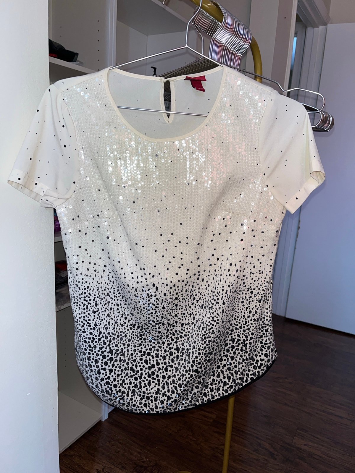Flaw: small stain on front of the blouse, shown in final image